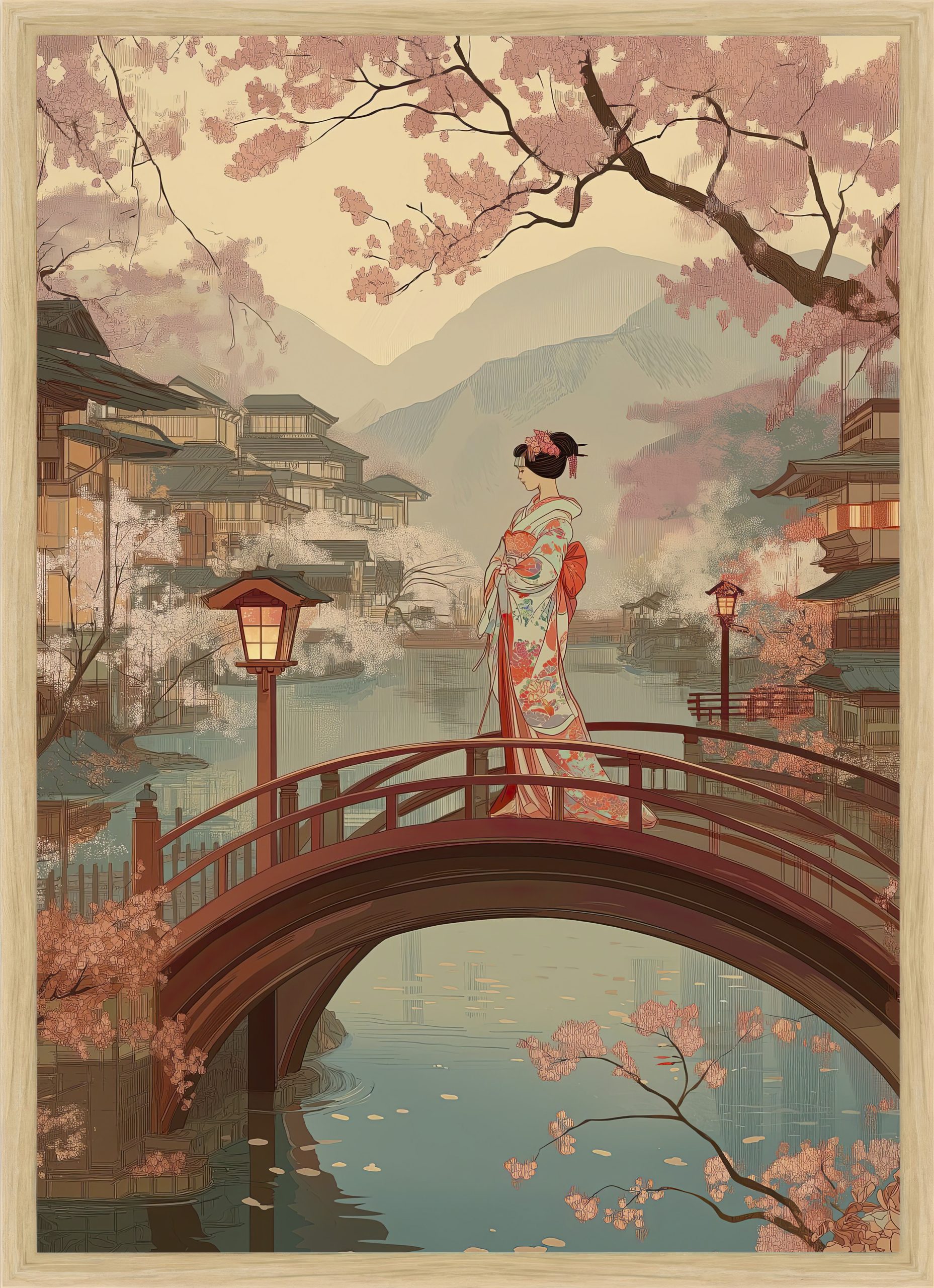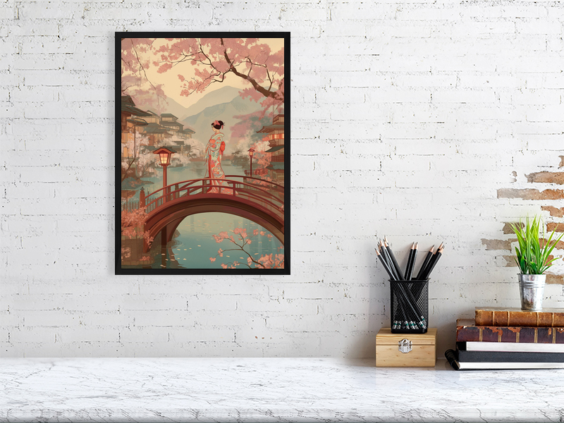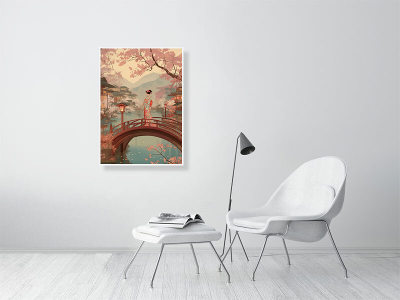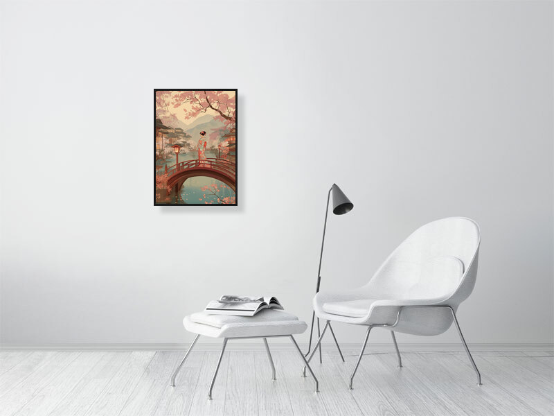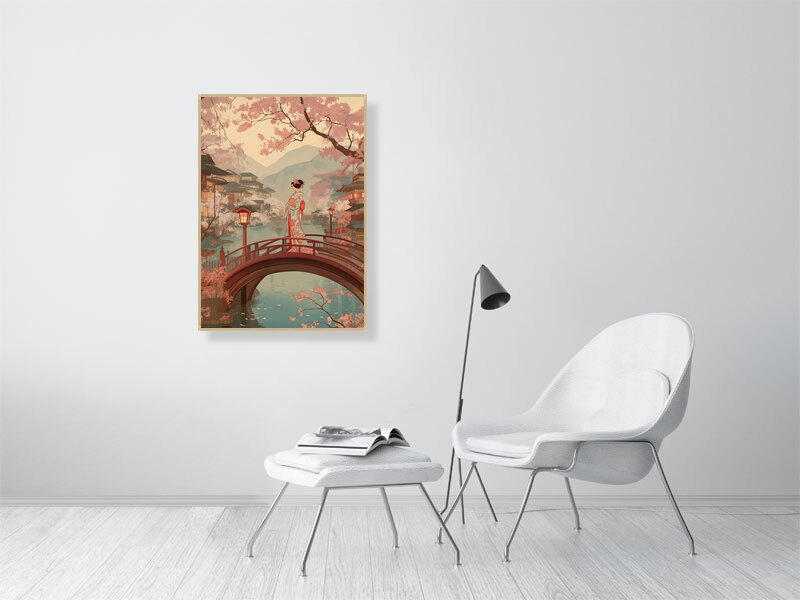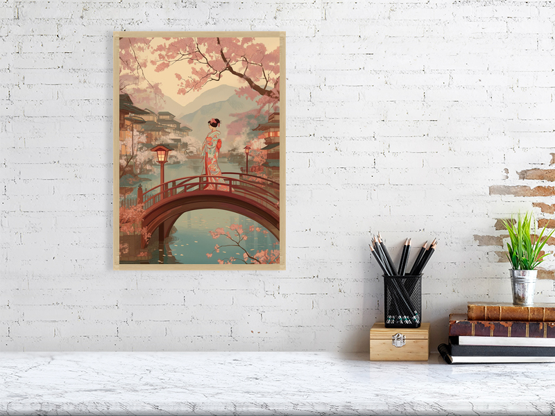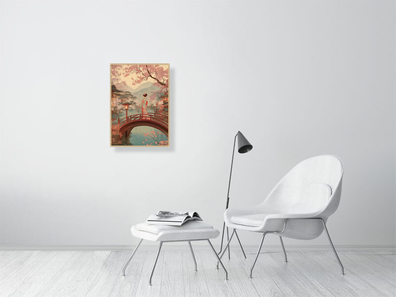 Inspired by traditional Japanese woodblock imagery, the artwork reflects themes of transition, presence, and quiet observation. The vertical composition and warm, muted palette invite slow looking and contemplation, making this piece especially well suited to calm interiors, bedrooms, studios, or spaces intended for rest and reflection.