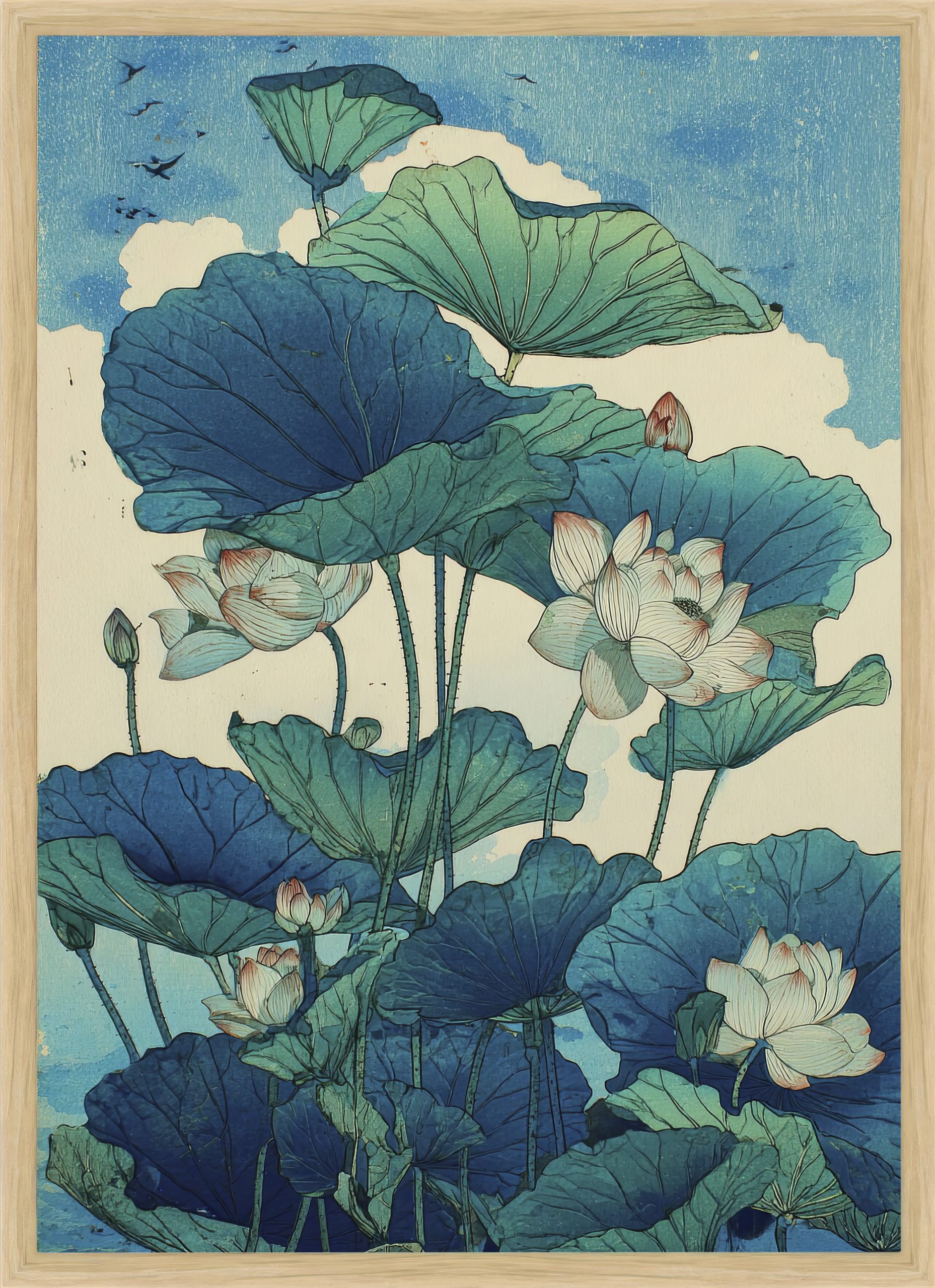 A tranquil botanical composition of lotus flowers and broad leaves rising against a soft blue sky. Layered greens and deep blue tones create a sense of depth and quiet abundance, while delicate blossoms introduce moments of lightness and balance within the scene.